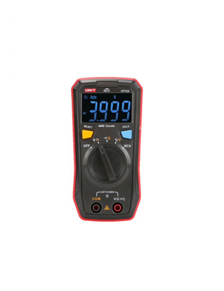El UT123 es un multímetro residencial de bolsillo diseñado para uso doméstico. La estructura compacta hace que sea fácil de sostener con una mano y la pantalla EBTN permite a los usuarios obtener lecturas claras en el ángulo máximo; también es ideal para trabajar en entornos oscuros.