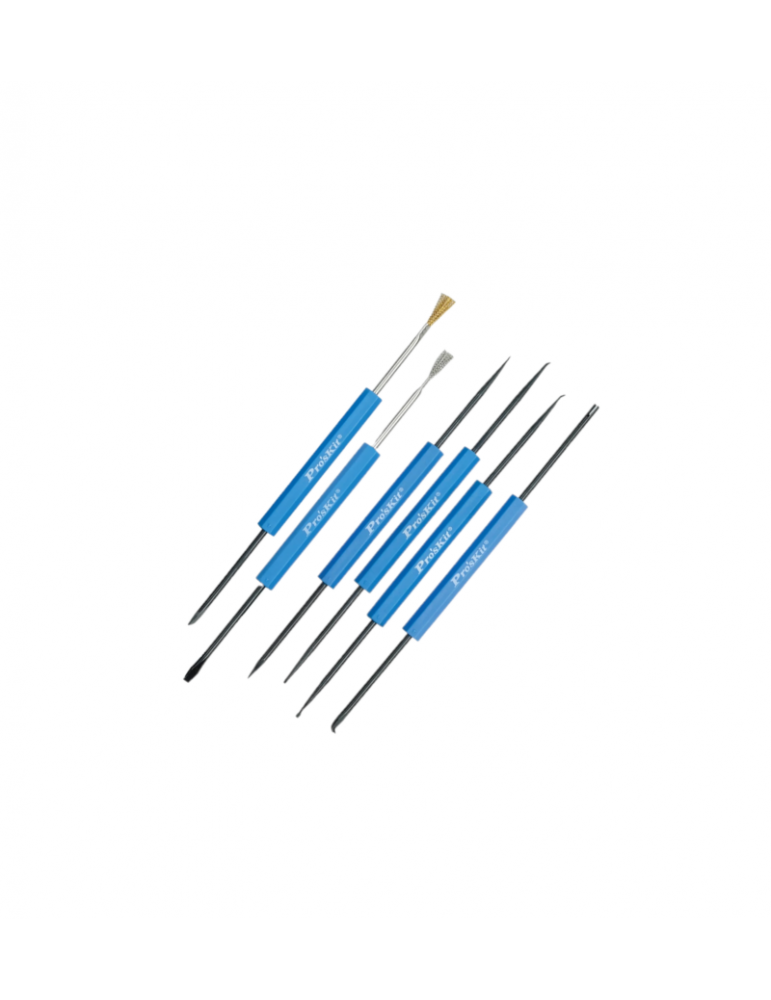 Herramientas auxiliares para retirar componentes, conectores, jumpers y otras piezas del PCB. El juego de herramientas profesionales Pro'sKit DP-3616 también es útil durante el proceso de soldadura y montaje. Contiene 6 piezas de doble cara con diferentes puntas muy necesarias durante los trabajos de mantenimiento.
