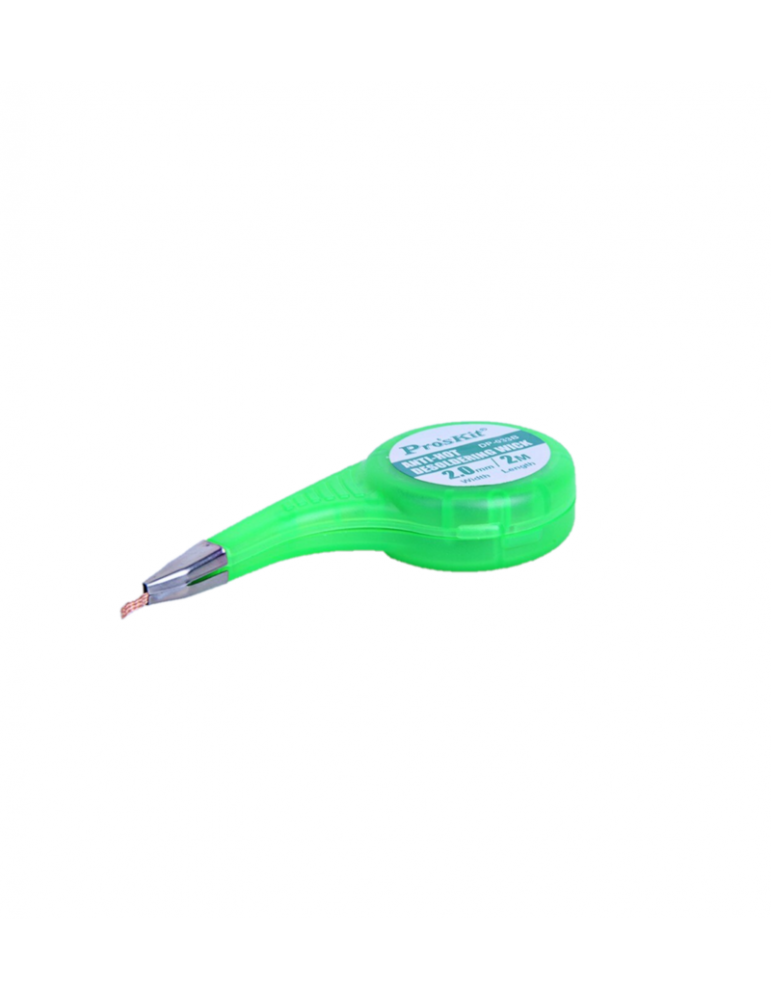 Hilo de cobre de alta calidad tejido con precisión en una trenza de 2.0 milímetros de ancho por 2 metros de largo, diseñado para quitar residuos, excesos de estaño en los PCB después de soldar o remover algún dispositivo del circuito. Tiene una excelente conductividad térmica y es resistente a la oxidación y corrosión.