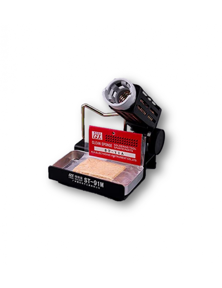 Estación de metal para soporte de cautín con espacio para colocar limpiadores de puntas (esponjas). Es una base de metal de alta calidad, resistente y muy estable sobre el banco de trabajo.